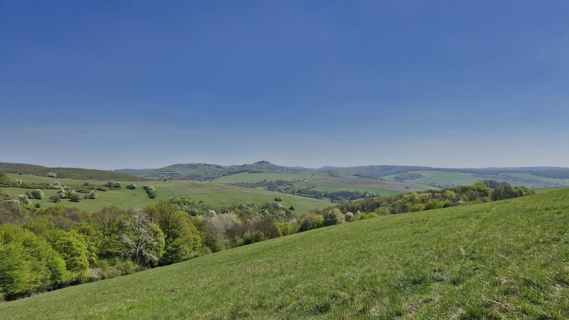 Jen pro ukázku. jsem sem dal dvě panoramatické fotky. Nejkrásnější na nich je to, že na obou fotkách je vidět kam půjdu. Jinak v dálce je vidět pohoří Malé Karpaty (napravo).